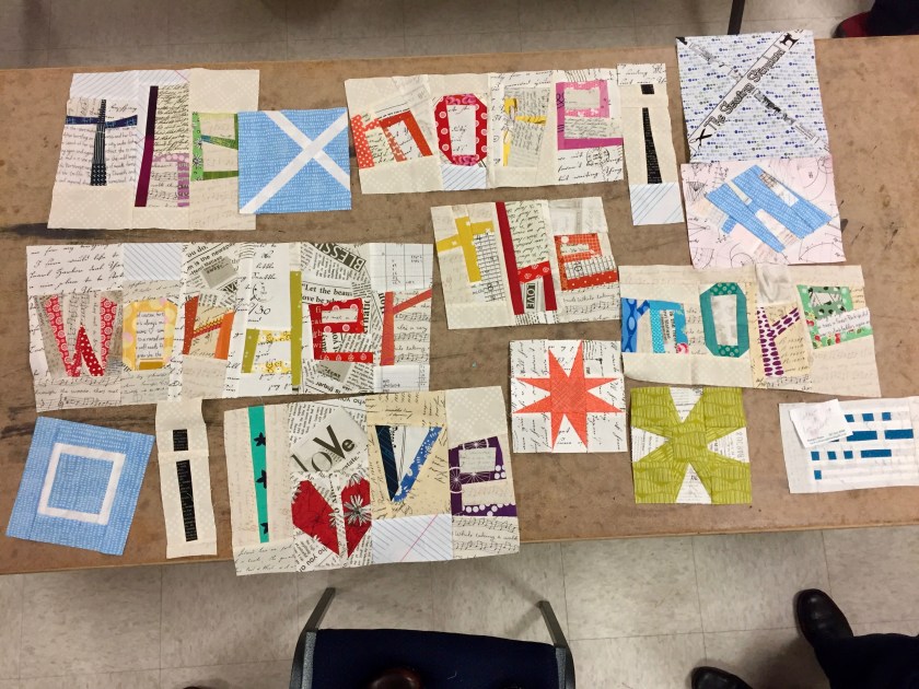Becca Babb-Brott (the words are her theme) kept her blocks separate and asked that we work on any one piece however we want but not connect them. Linda Satkowski made lots of blocks that Becca can add where she wants. The block on the lower right has a “secret message”–in Morse Code. These two have been discussing Morse Code quilts over the past year.