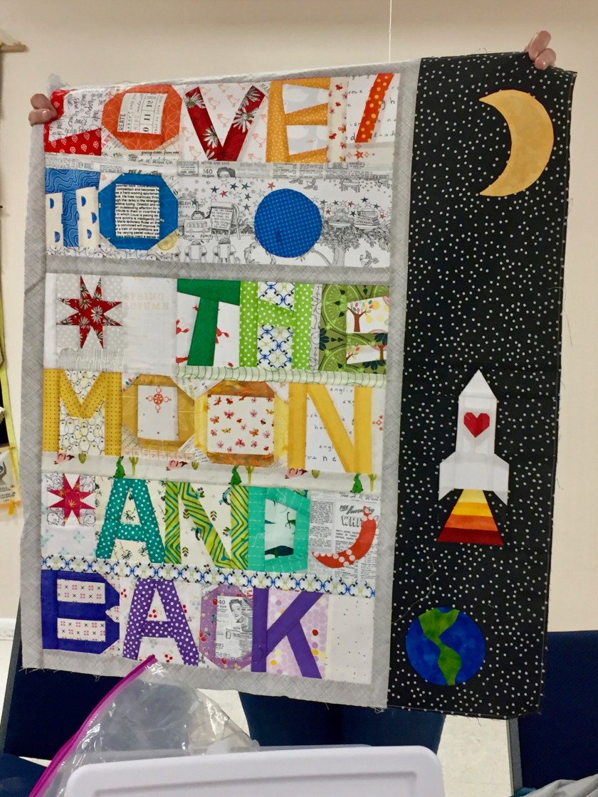 My quilt (Love), with a very fun addition by Lynn Vermeulen. The black really pops the colors, doesn’t it?