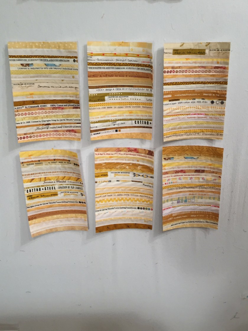 I color sorted my selvages and am now making rectangles–using a pattern by Amy Friend, “Circuitry” from her book INTENTIONAL PIECING, but I’m making the rectangles bigger. I’ve done blue, aqua, red, and yellow and am working on purple. Here are the yellows: