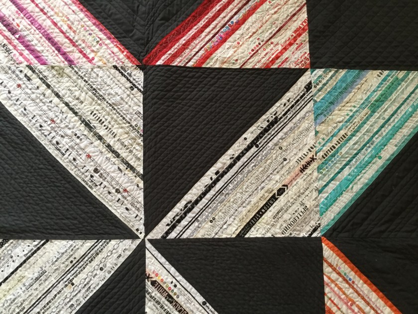 Well, for one thing, the blocks shrink up a bit when sewn with selvages. I lost a few star points in that process. But, I also learned A LOT. Next time I’d cut my background (the charcoal) a bit bigger, and I’d draw a line for the first strip that is the true center of my finished block–never mind the extra bit on the edges. Then I’d trim where needed, but keep my center line on target. I think that might work.