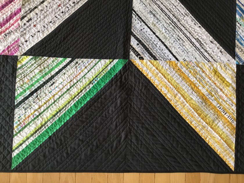 I had a lot of fun quilting this quilt. I did the selvage bits on the long arm. I had to rock back and forth a bit as my long arm has an 18-inch throat and the selvage hals-square triangles are longer than that. Rocking worked fine. Then I pin basted the quilt as I unrolled it, which works well to keep everything straight for sewing on the domestic. My Janome 8900 has a stitch that will lock at the start and at the end automatically and does not leave a big knot–IF YOU BRING UP YOUR BACK THREAD FIRST as you would with free motion quilting. You can trim those threads from the front and the end of the line from the back. So, I sewed each line separately, which meant I did NOT have to keep turning the quilt.