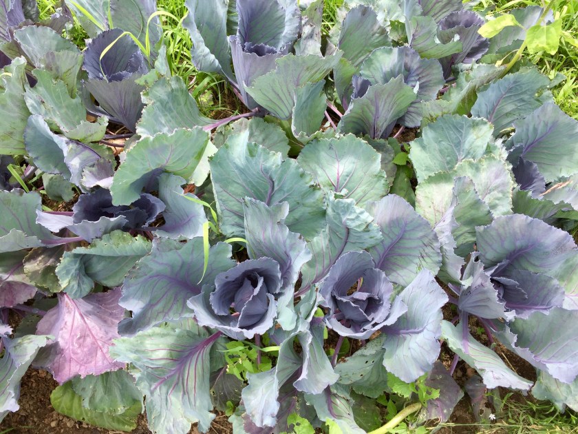 I stopped on my way out leaving to take this picture of a row of cabbage as the colors were so beautiful. This cabbage must be in the red family, but I’ve never seen this lavender and aqua form before now.