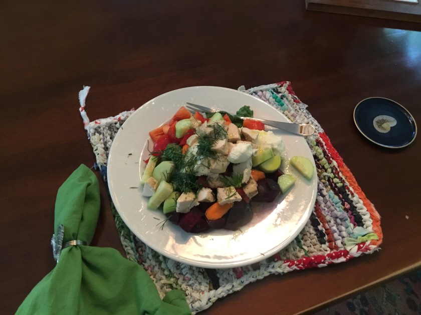 Here’s a typical lunch for me these days: a big salad with lots of fresh veggies and some meat protein. This one has boneless chicken breasts marinated and flash roasted and an array of local fresh produce: roasted beets and raw cukes, red peppers, carrots, lettuce, fresh dill, olive oil, and salt.