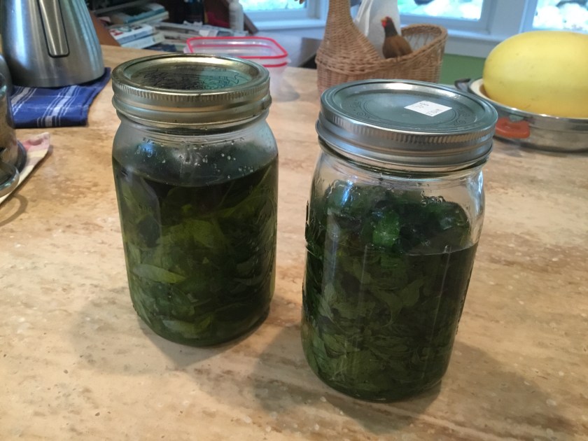 Betsy Maislen told me that one could strip out all the basil leaves in the fall, pack them in a jar, cover them with olive oil, and enjoy them all winter. She swears they stay nice and green. If basil works, why not mint?? So I picked mint tips too. At the very least, the oil will be great for flavoring and salads. I LOVE a hint of mint in sautéed veggies.