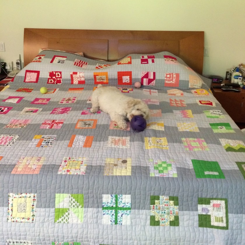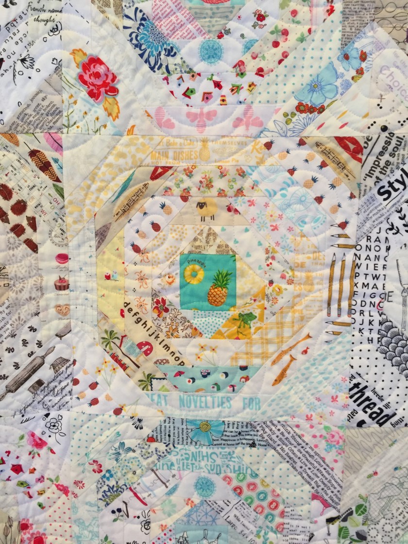 This setting is one Tula Pink suggests in the book. But Heidi, unlike Tula Pink, sorted the blocks by color. It came out great, don’t you think? I also like the wavy grid quilting! A lot!