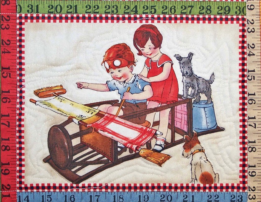 Many facets of this quilt make it wonderful: the subtle use of color, the block itself, the clever use of text fabrics, and the whimsy in each block. Take a look at some of my favorite blocks. It was hard to choose which one were “favorites.” I could have taken a picture of each and every block. Of course I have to start with CHICKENS.