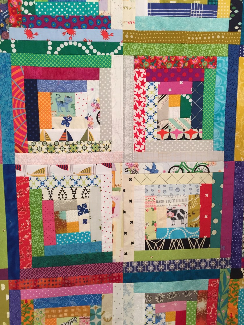 It is a joy to work on a quilt that is squared up properly–and that is what happens when one is anal about making sure every strip sewn on to a block is “true.” If not, fix it at that spot. It’s really easy to get “off” with log cabin blocks. I keep a square ruler on my ironing board and measure as I iron each strip. That practice saves me time in the long-run and a lot of anxiety as I quilt the quilt on the longarm, which is so not forgiving of our-of-true quilts.