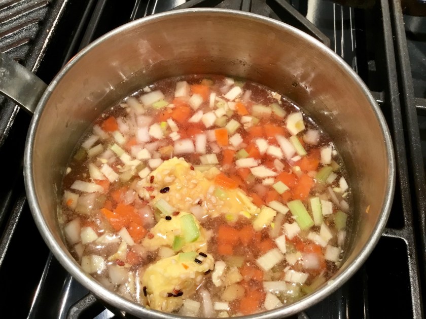 Now I got out my HEAVY crust pan, put in some duck fat, and started sweating veggies. I use what I have on hand, and I keep a lot of veggies on hand. What you see here is yellow squash, carrots, onion, garlic/ginger, cauliflower, cabbage, and celery. Along the way I added some dried herbs: Penzey’s and dried mint from my garden. The dried mint gives the soup a deep sweet note. I order a variety of Penseys dried herb mixtures in the fall, and in the summer I add fresh herbs from my garden. I also might add some of the basil I put down in oil last fall–still bright green beneath its layer of oil. (There is an earlier blog post on how to do this–learned from Betsy Maislen.)