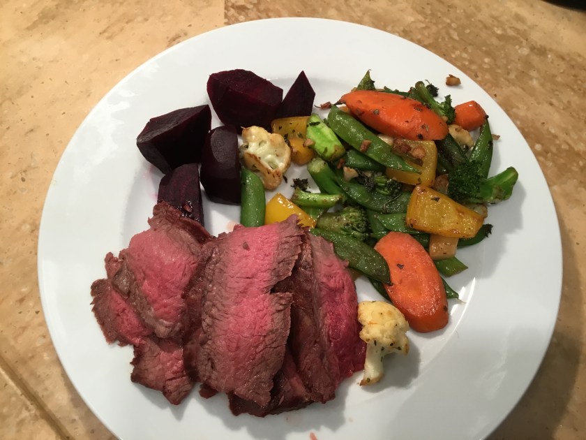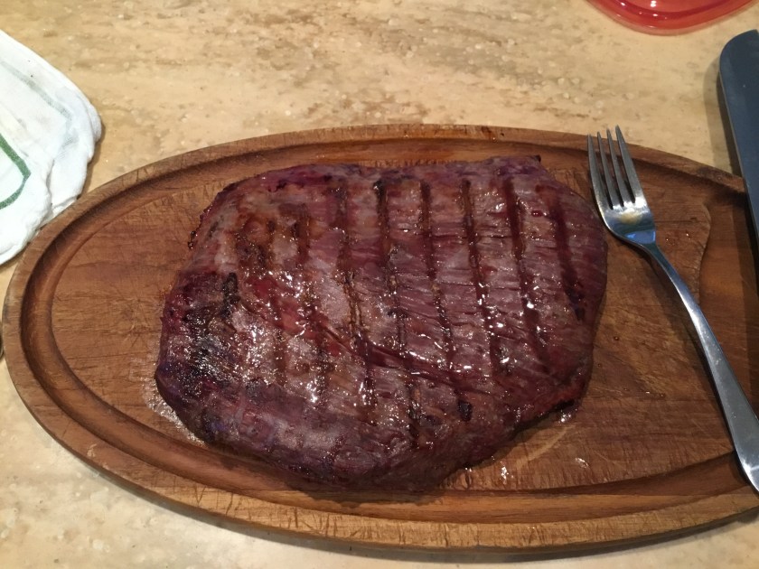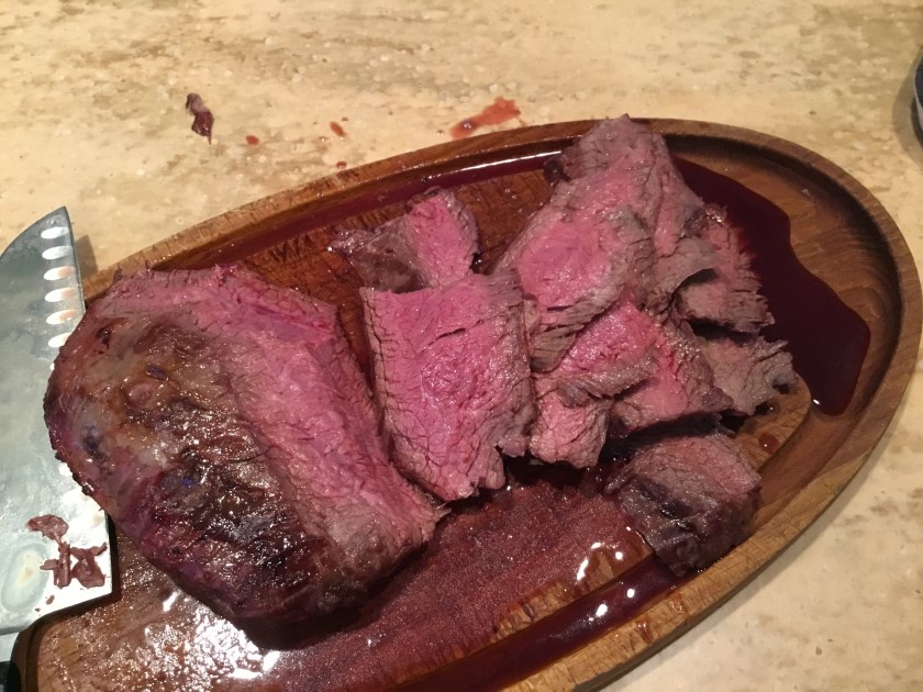 Slice flank steak across the grain. Look at all the extra meat I will have–some to freeze for my quilty trip and some for leftovers.