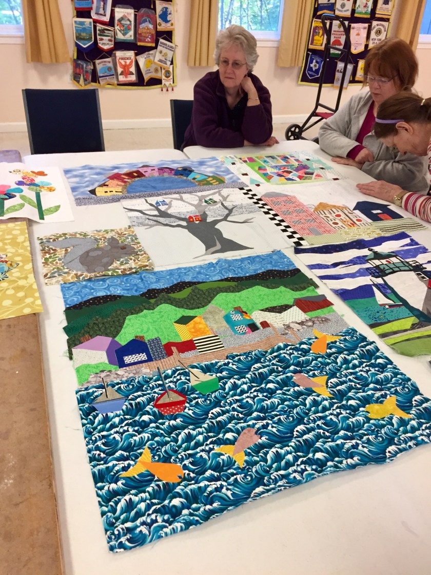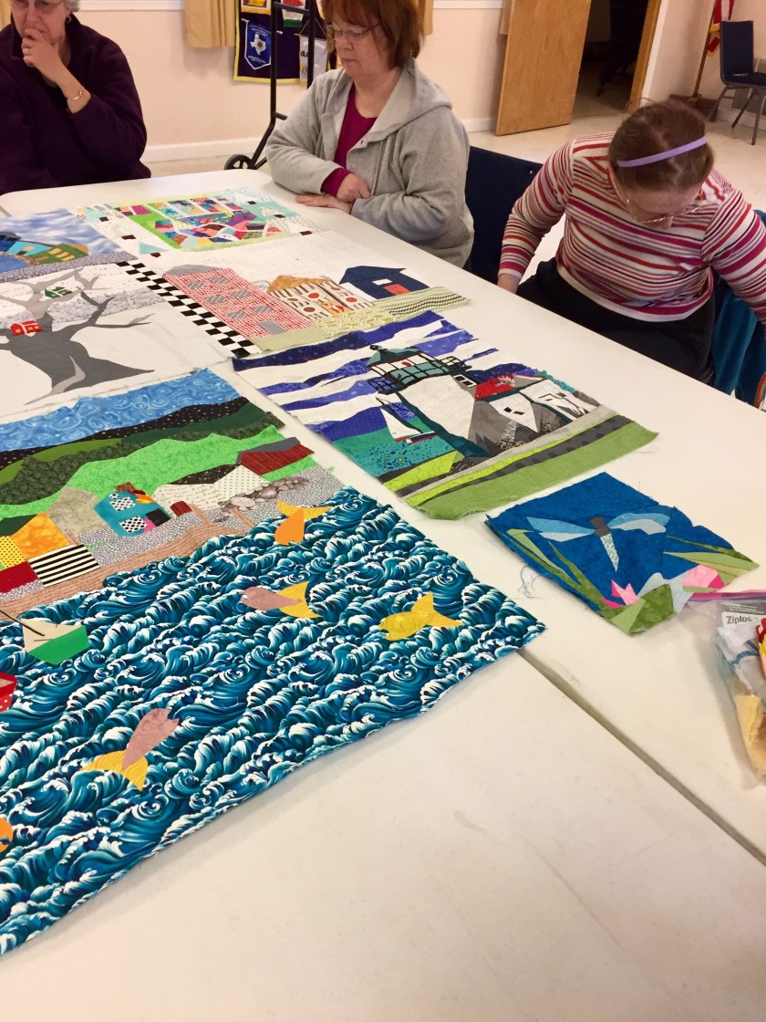 I played around with Amy Friend’s “Circuitry” quilt (in her INTENTIONAL PIECING), wherein she uses selvages. I made the blocks bigger and used patterned fabric to make the rectangle. And, I kept to the cool colors: blues and greens and some purples.