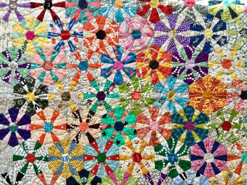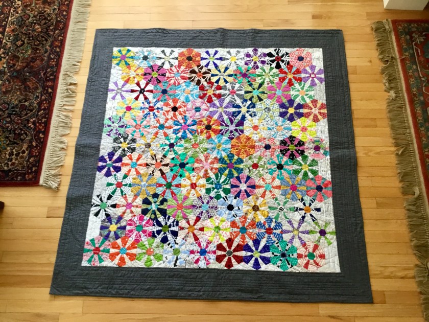 Here is “Whirlygig,” a version of Willyene Hammerstein’s “Valse Brilliante” English Paper Piecing quilt, from her book MILLIFIORE QUILTS.