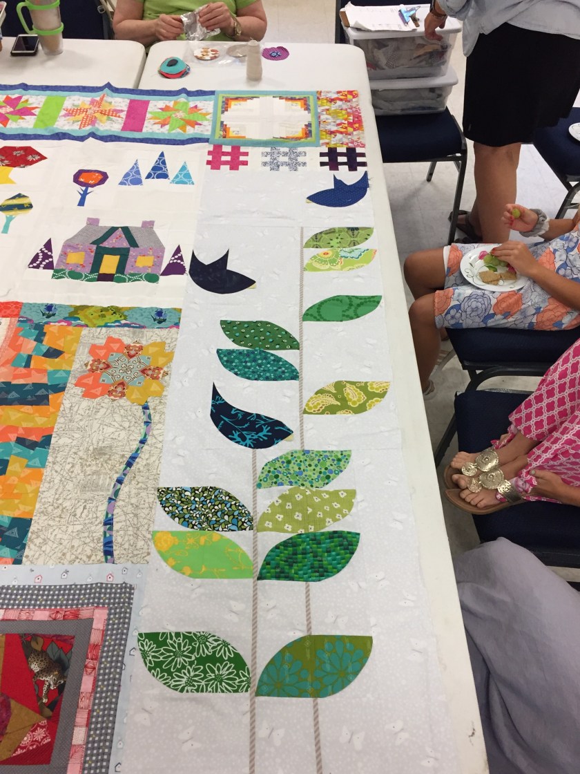 Here is Margaret-Elaine Jinno’s quilt–which is going to need some work on the bottom right. We are discussing making a lot of trees for a forest for her to the right of the florist shop and the turtles. She started with the houses and trees on the left, beneath the upper banner. M-E’s granddaughter made a drawing that M-E made into a block. Linda Satkowski added the final block–the red and white lighthouse on the upper right.