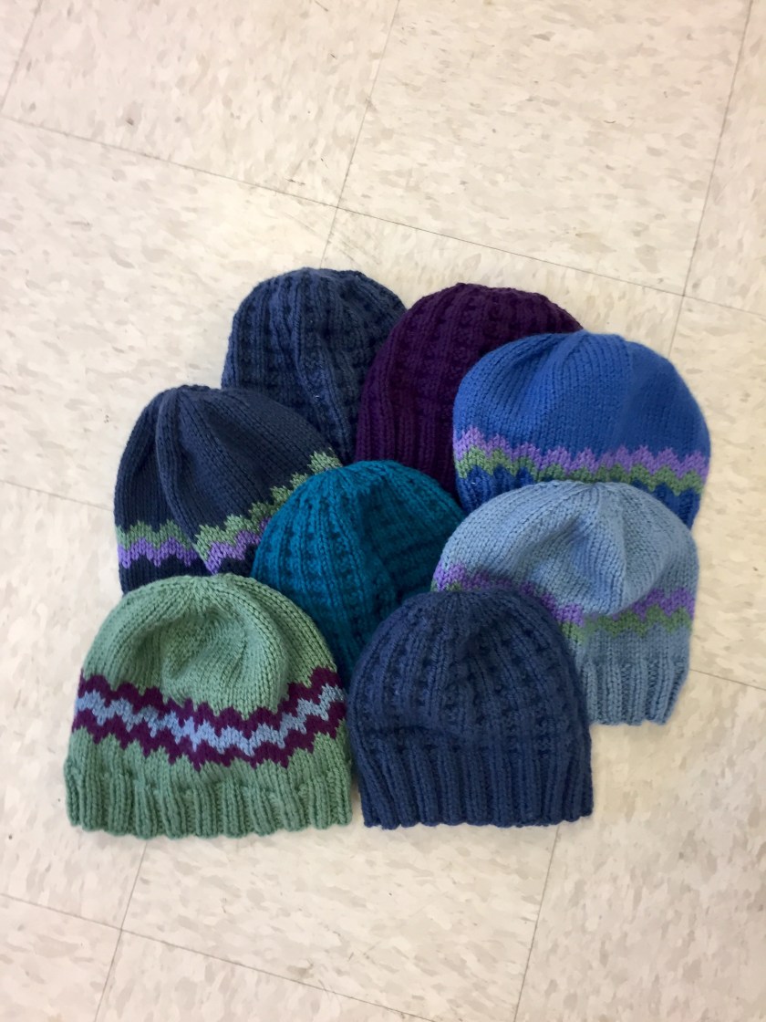 She’s been knitting knit hats for a state event for disabled children. Each year specific colors are selected, and knitters can combine them as they see fit. The hats with a yarn-color pattern will go to this event. Solid hats will be donated locally. Our library, for instance, has a Christmas tree every year where local matters hang hats, mittens, and scarves.