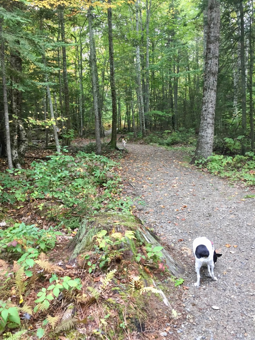 I am so lucky here in Maine to have access to gorgeous “wellness” and other woods paths where one can take one’s dogs and walk them off-leash, providing they are well behaved and that any waste is picked up. Even having to walk a dog on leash is better than village streets and sidewalks. There is so much more for everyone to see, and a dog like Slaty can really work out his kinks.