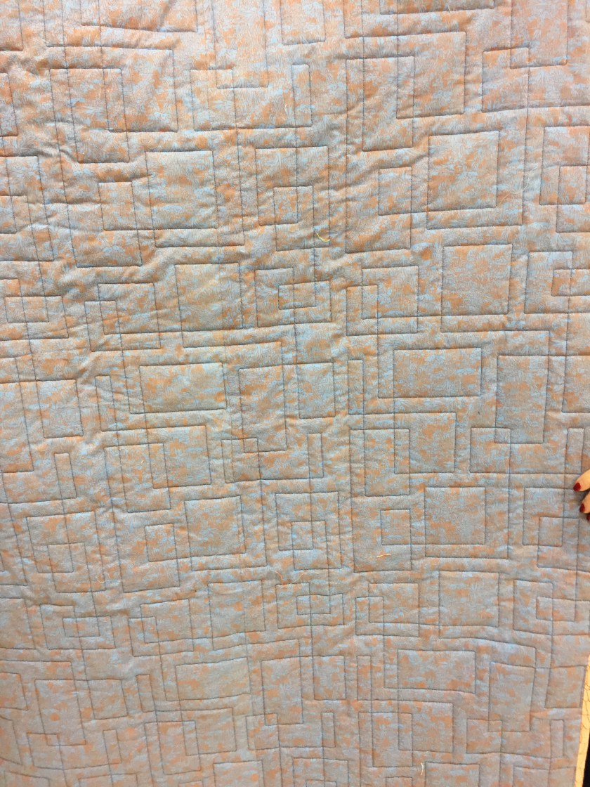 I love the quilting pattern used on this quilt. It has the feel of the large rectangles on the front and the rectangle’s center openings.