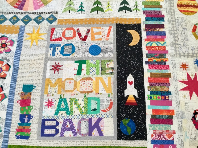 NINE women worked on this quilt. I started it with the “Love You to the Moon and Back” block. The quilt then “traveled” through the hands of eight other quilters, who added blocks and sewed blocks together when they could. At the same time, I was making blocks and joining up sections when I could for each of the other eight quilters.