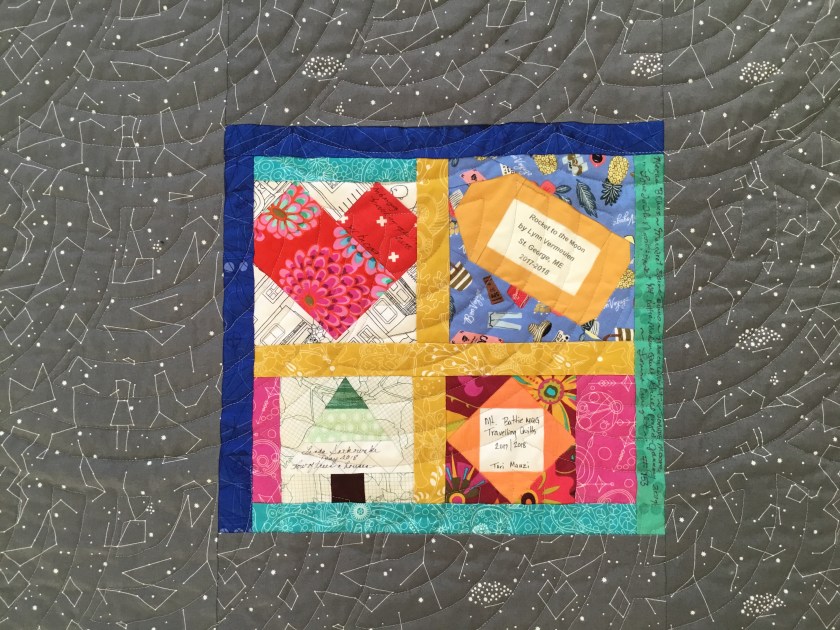 I used Lizzy House’s new fabric line “Constellations” (Andover) for the backing and binding. And used my Bishop Fan groovy boards to quilt with a light grey thread. Four of the quilters made labels for me, and I wrote the names of the others into the side of the lable.