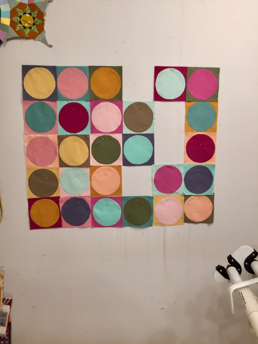 Progress on the circles made with the fabric Tara Faughnan, from THE COLOR COLLECTIVE, at Sewtopia, sent. I’m liking the scrappy nature—am still moving around blocks like crazy though.