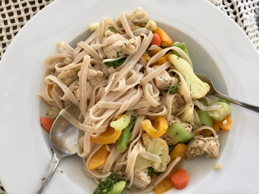 Noodles, broccoli, cauliflower, carrots, a yellow pepper, a head of bok choy—and I should have added some celery—chicken, ginger, herbs, and garlic. I eat a lot of veggies at the two meals I eat in a day. I almost always have an apple for “dessert,” but vary that with frozen/defrosted organic Maine wild blueberries and the strawberries and raspberries I froze from my garden.
