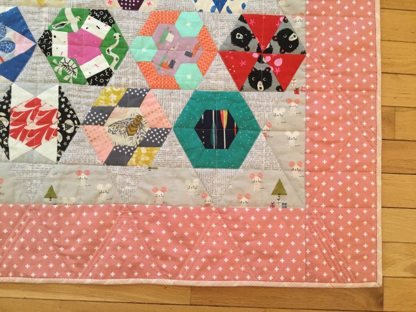 I quilted the “diamonds” that are present on the front of the quilt on my domestic sewing machine, using a walking foot. And added some stabilizing cross lines. But I put the quilt on the long arm to make the quilt package. That works really well I’m finding. It is much easier to pin with no issues on the long arm. I like the quilting in the border as well. It’s all very geometric, like the hexies and star points.