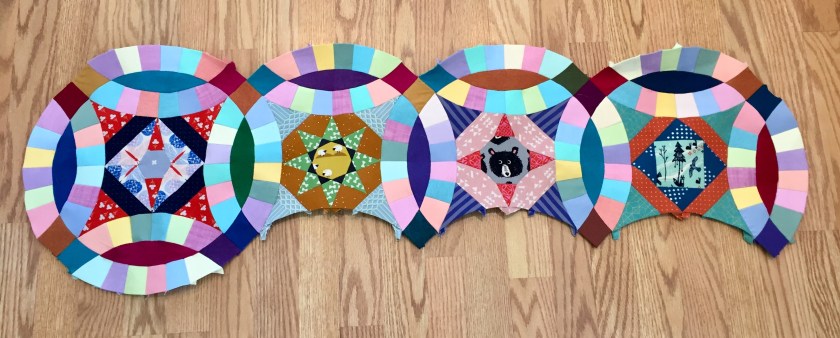 I have SEVEN GRANDCHILDREN, and I want each of them to have a hand-piecedquilt from me. I have six done now, and am working on the 7th—a wedding ring riff called “36-Ring Circus.” I just completed the fourth “ring” last night. It will have 6 by 6 rows/rings.