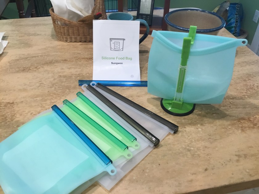 So this week, I ordered some products to try: silicone bowl tops and baggies and some grocery bags meant to replace plastic bag use in the grocery store. These items are available in lots of places, so just google what you might want to try. I deemed them affordable in the long run.