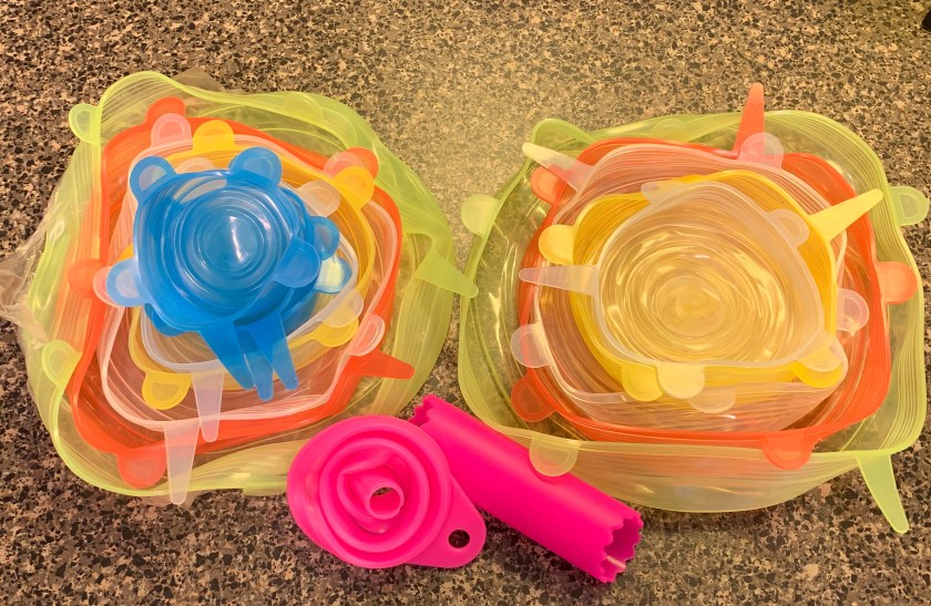 Here are the plastic tops meant to cover bowls—they stretch so can cover differently sized containers. The pink items are a collapsible funnel and a tool meant to take the skin off of garlic as you roll the garlic cloves inside it.