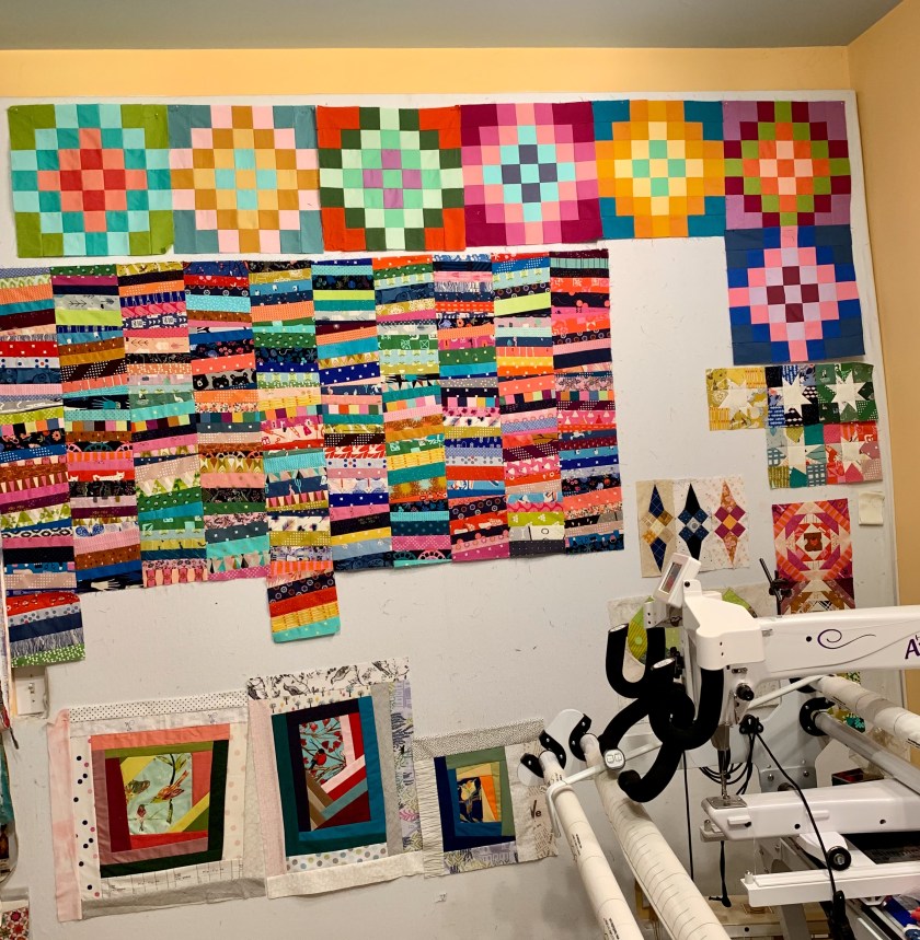 To the right:  Bonnie Hunter’s funky stars—the colored fabrics are Cotton+Steel.  There is a BH pattern for this funkiy block, but it’s also a block that has been around for ages.