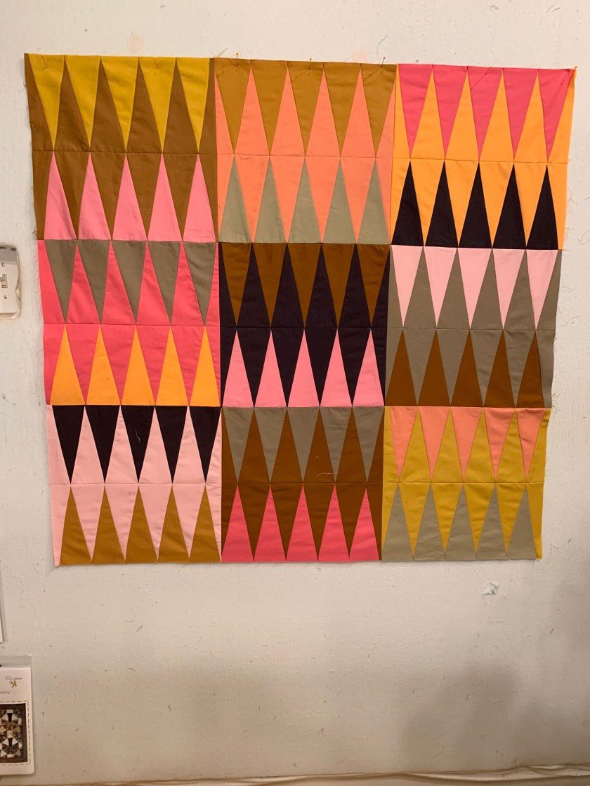 I’m quilting (big stitches with size 8 perle cotton) the “6-pointed star” quilt from Tara Faughnan and Amy Newbold’s The Color Collective project on Sewtopia.  (Season 2 is coming in October—and I’ve done other posts on this project which uses a TF-curated color palette in solids.)  I continue to be fascinated with how geometric shapes can play off of each other.  I am using all dark thread colors for this one as I don’t want the brighter/lighter threads to distract from the geometric shapes.