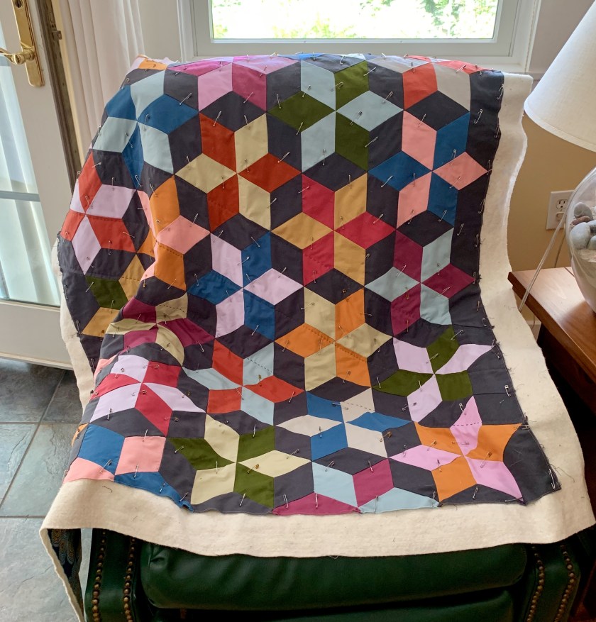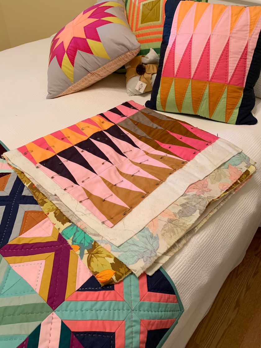 It’s pinned and ready to go for hand quilting.  I will use the brighter thread colors in this one.