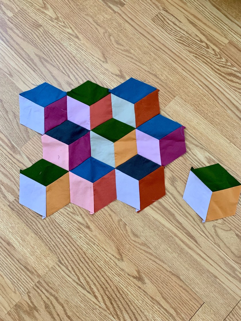 These are leftover pieces sewn into a tumbling blocks form—from the 6-pointed star.  NO!  JUST NO!  It’s intriguing, but its going into the Parts Department bin—and maybe will be surrounded with neutrals down the line in the next improv quilt.  I want to circle back to the Lone Star and Radiating Log Cabin projects—you can see those in the pillows on the bed.