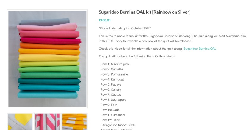 One could do the rainbow version, with fabrics Sugaridoo chose, as seen below. One could buy Sugaridoo’s kit or just collect the listed Kona fabrics elsewhere. One could also do a version with less fabrics that is not rainbow. Or, one could put together whatever fabrics one wanted. The goal is to learn some new techniques (or refresh old ones) by making a bar of the quilt each month for a year.