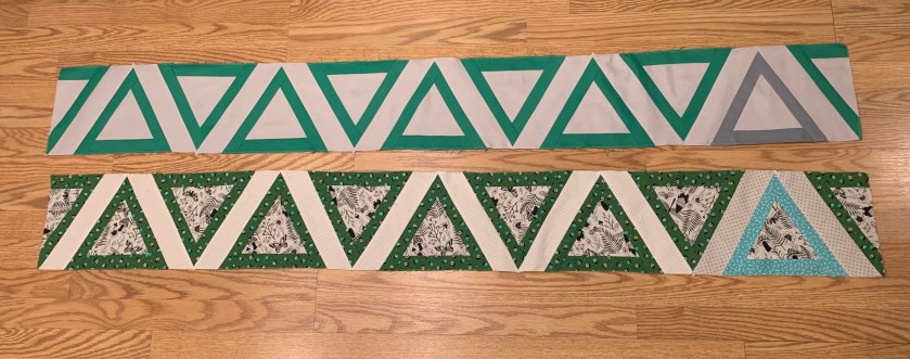The printed fabric row I made with the freezer paper method, which I love. BUT, I think I am not sewing quite close enough to the folded line and that might account for some points being a bit close to the edge.