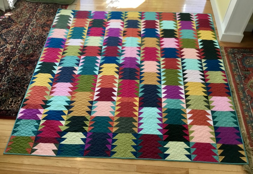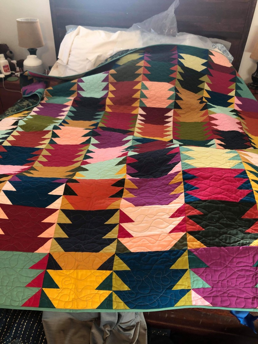 Tara Faughnan of Sewtopia’s The Color Collective online class designed the block and curated the fabrics. I added more greens as I had them on hand. The quilt is called “Stacks.” I think it looks a bit like a modern, graphic version of stacked mountains. And I love the lines of triangles that form between the rows. I freehand quilted in a medium grey. I wanted lots and lots of movement—like winds blowing and moving air currents.