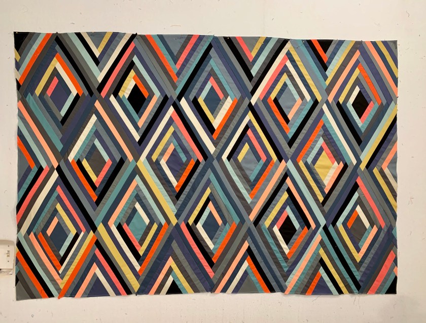 I’ll be layering and pinning the solid scrappy trip/granny quilt from Then Came June (Checkered Garden) today. I want to diagonal grid quilt it on a domestic, but will pin it on the longarm. I loved Then Came June’s version and thought it would be a good use for the solid scraps I have. It’s bright and wild. And maybe that’s it’s name?