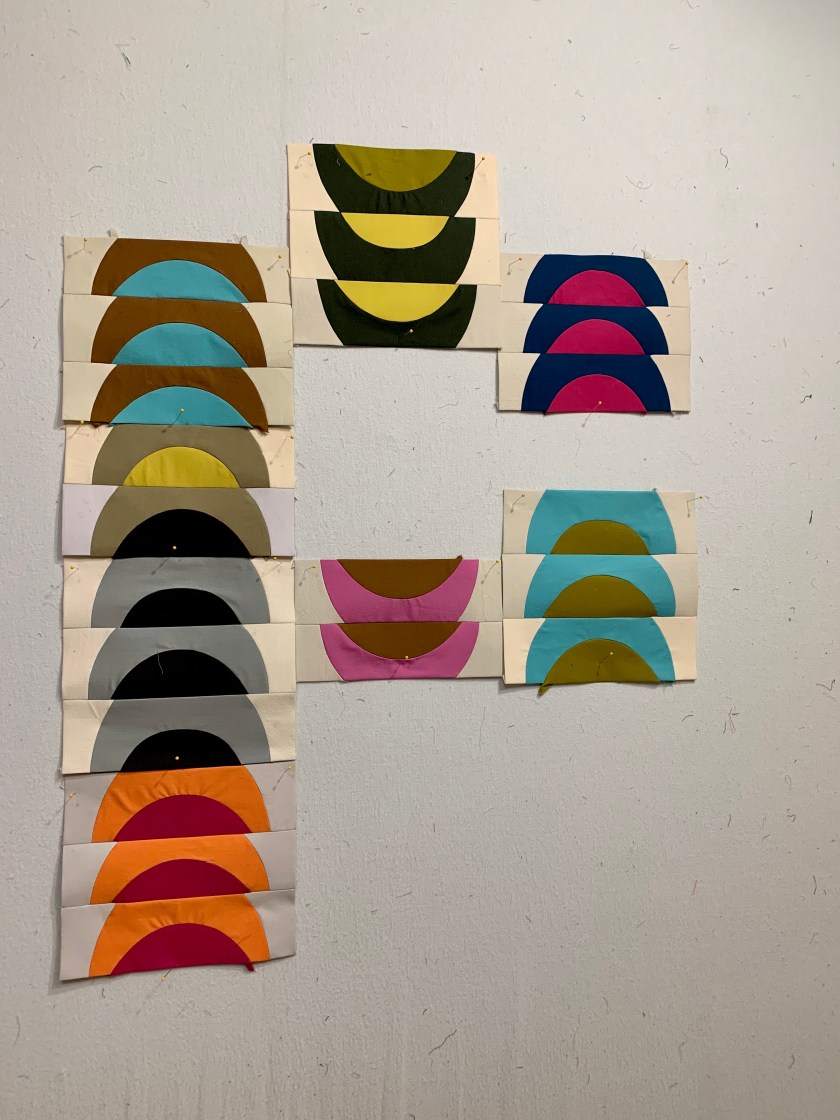 I am also playing with a two-round smaller version with the extra fabrics I have. I have no idea where this project is going. Play without a goal is important too.