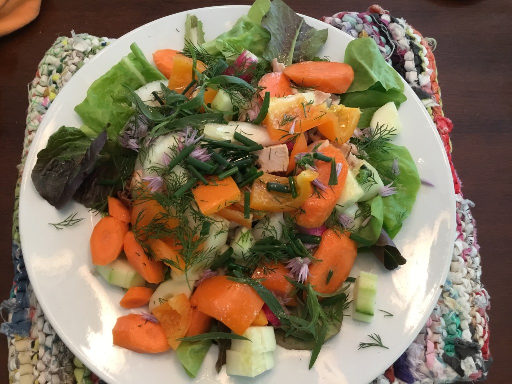 Here was my reward, topped with fresh dill, chive flowers, chopped chive stalks, and tarragon. The lettuce is from my garden, too. The protein is roasted chicken.