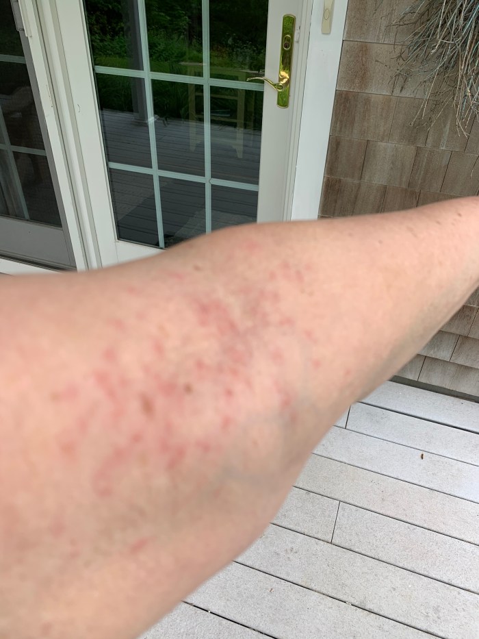 While heaving diatomaceous earth at my blueberry, raspberry, and strawberry plants in an effort to kill the caterpillars munching their way through them, I got one on my shirt sleeve—a long-sleeve heavy cotton t-shirt. I did not take off the shirt immediately. By nightfall, here’s what happened to my skin under the layer of the sleeve:
