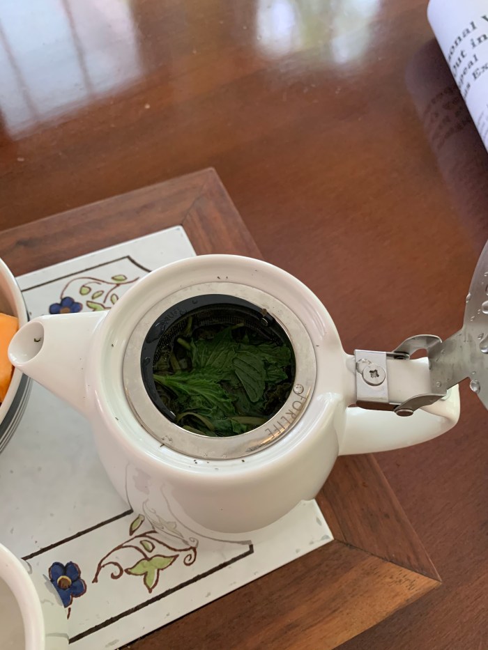This little pot comes with an insert where one can put a loose tea. I stuffed it full of my dried mint—which I dry every fall. And I added some sprigs of fresh mint and tarragon from the garden and let it steep while I ate my lunch.