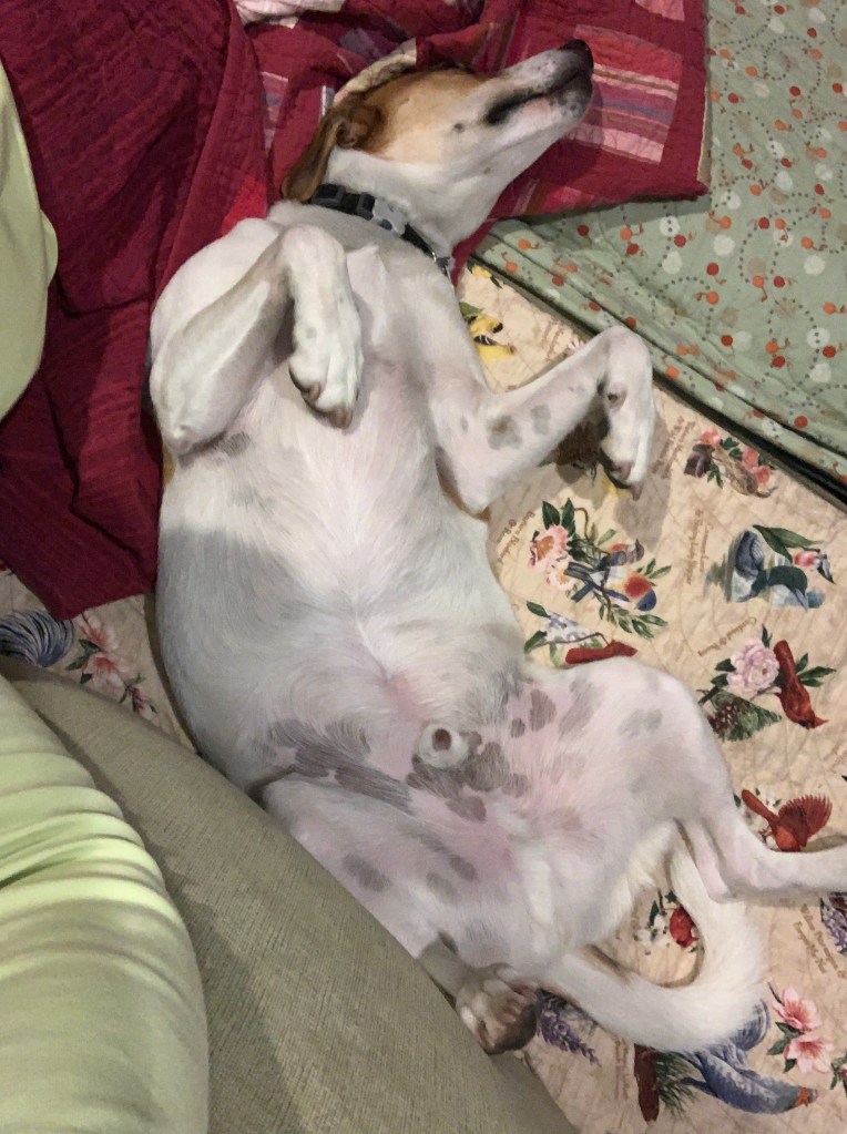 I uncovered a little one yesterday—6 or 8 inches—while trimming back the climbing hydrangea on the wall along the path—s/he was up by the house and went under the lower set of shingles above the concrete strip on the ground. So, AC spent most of our many hours outside going from one “snake” place to another. And, of course, checking on “mouse” at the compost bins, and “squirrel” on the upper porch, and “chipmunk” on the stone wall in back. He was really tired after his dinner. But happy.