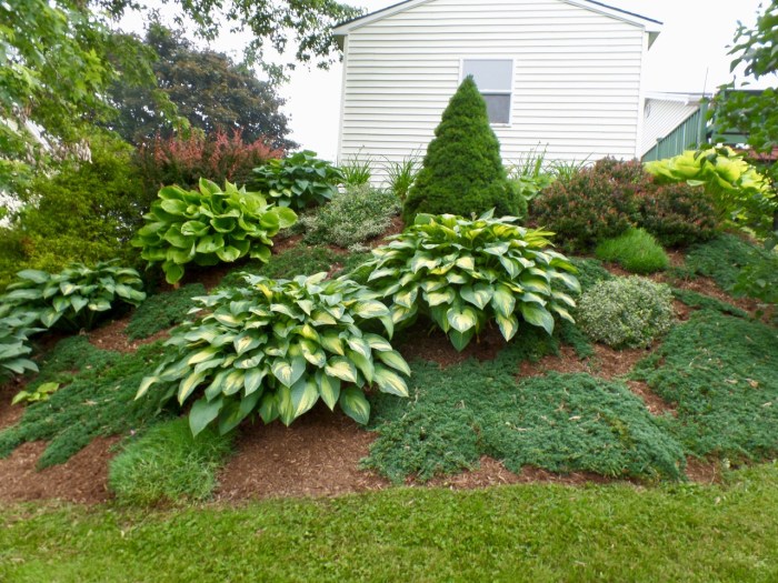 And behind this bed (just visible at the top right of the above photo) there’s a steep embankment along the back of the garage. This area is a challenge to garden. The area is steep, so needs plants that will hold the soil. And, it is dry, so needs plantings that will tolerate dryness as well. Here I’ve incorporated a mix of hosta (large leafed and with a varied color range to add interest to this otherwise non-blooming area) and a mix of evergreens. There are also barberry to add a touch of red.