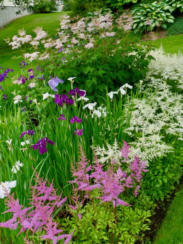 July 8th: The “bog bed”: astilbe, Japanese iris and filipendula.