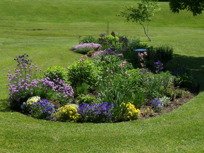 June 13th. The larger bed with chives, violas, aquilegia (both pink and purple hybrids), and pinks in bloom.