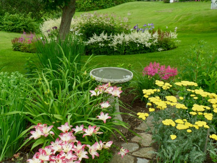 July 4th. This is the center of this large bed. Once again I’ve used the achillea “Moonshine” to facilitate moving the eye from one area of the bed to another, but still maintaining the overall color scheme. However, here the pink color comes from a small, but prolific asiatic lily (“Lollypop”) and a dark pink astilbe—which mimics the darker pink on the edge of the asiatic lilies.
