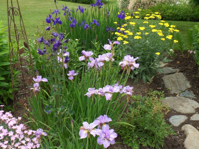 June 22, far end of above bed with Siberian iris (“Midnight Velvet” and “Ranman”), aquilegia (purple hybrid) and achillea “Moonshine.” Pinks are in the lower left.