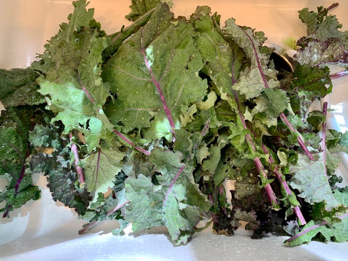 While I was at it, I prepped the BIG bunch of kale from Hope’s Edge. I love the lavender color of the stems, but I just tear off the leaves from the stem with my hands and put the stems in the compost.
