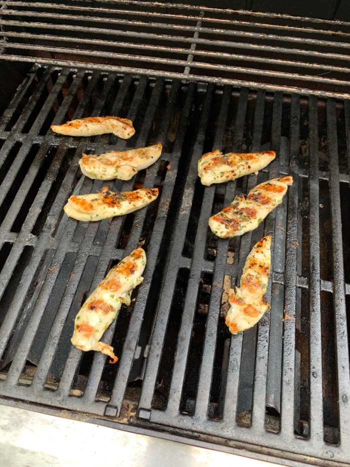 I love that my little grill is “all ready to go” on my back deck this year and that when I fire it up, it is hot in under 15 minutes. I splashed some olive oil, salt, and herbs on some chicken tenders and they cooked in 6 minutes flat. AND smelled delicious.