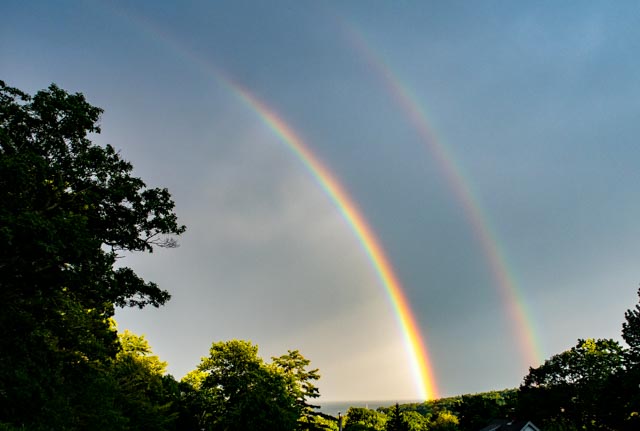 Last week, friend Marsha Smith sent me this pic of a double rainbow, taken from her porch, which is on a hill that looks out over the town and the harbor. Wow.