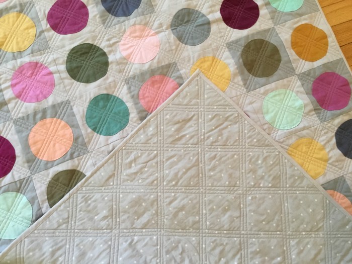 The back story on this quilt is that when I did the very first Color Collective project, big circles were involved. When I cut the centers out on the back side, I had all these little circles. (There was also a trial small project from my own solid fabric first—and some of those circles are in this quilt.)