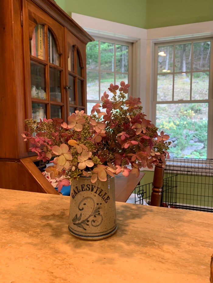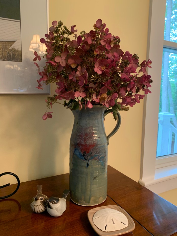I planted a Pee Gee Hydrangea (which grows into a tree size over time) some years back. Each year I prune it and bring the flowers inside—otherwise it gets too bushy and starts taking over the view out of the guest bedroom window and overhanging the back deck.